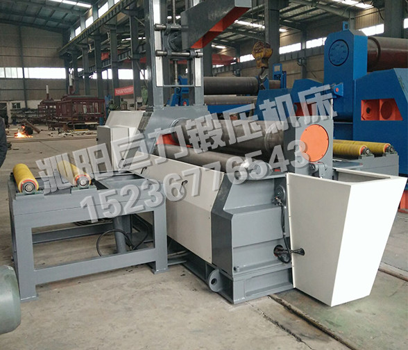 該四輥卷板機(jī)與對稱三輥卷板機(jī)比較,它可以不借助其它設(shè)備模具,直接予彎板材端部,而且剩余直邊較??;它可以不使板材調(diào)頭,而卷成工件。
