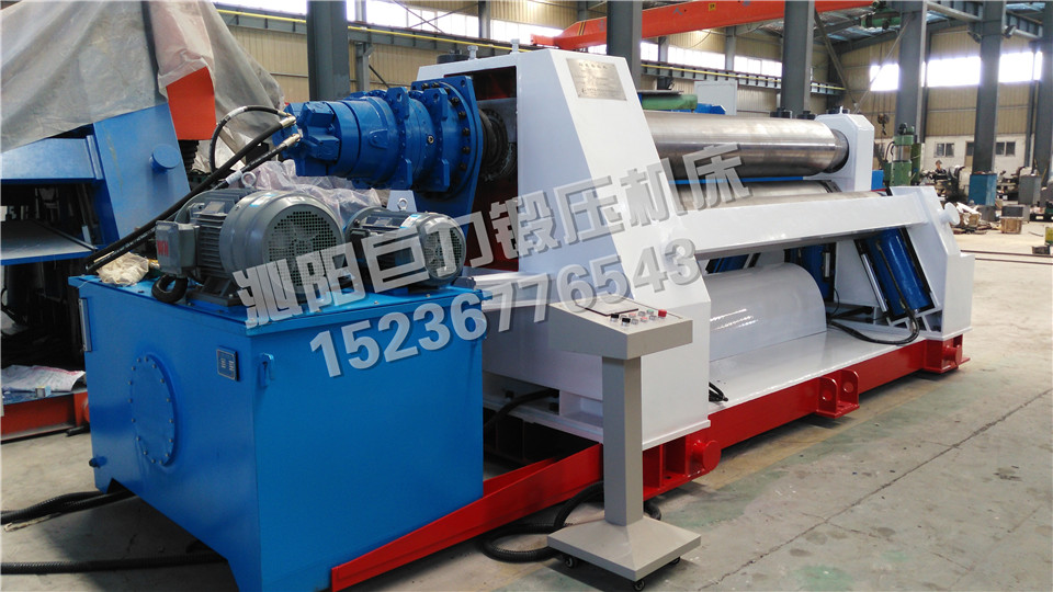 該四輥卷板機與對稱三輥卷板機比較,它可以不借助其它設備模具,直接予彎板材端部,而且剩余直邊較??;它可以不使板材調頭,而卷成工件。