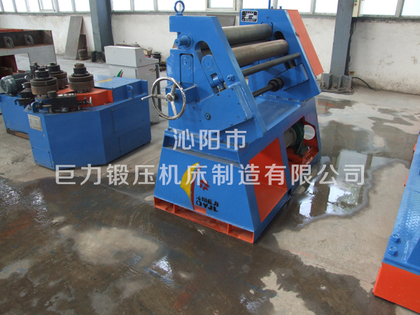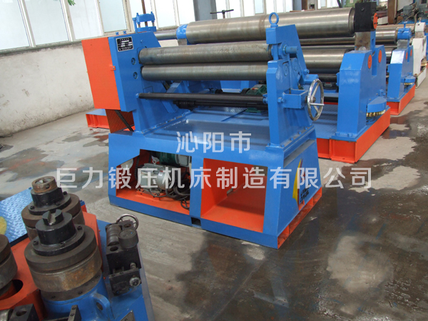 三輥非對(duì)稱式卷板機(jī)結(jié)構(gòu)形式為三輥非對(duì)稱式,上輥為主傳動(dòng)輥,在兩下輥中央對(duì)稱位置作垂直升降運(yùn)動(dòng),通過液壓缸內(nèi)的液壓油作用子活塞而獲得,為液壓傳動(dòng);兩下輥體旋轉(zhuǎn)運(yùn)動(dòng),通過減速機(jī)的輸出齒輪與下輥齒輪齒合,為卷制板材提供扭力,同時(shí)作為主傳動(dòng);邊輥?zhàn)鲀A斜升降運(yùn)動(dòng),具有預(yù)彎和卷圓雙重功能,結(jié)構(gòu)緊湊,操作維修方便。