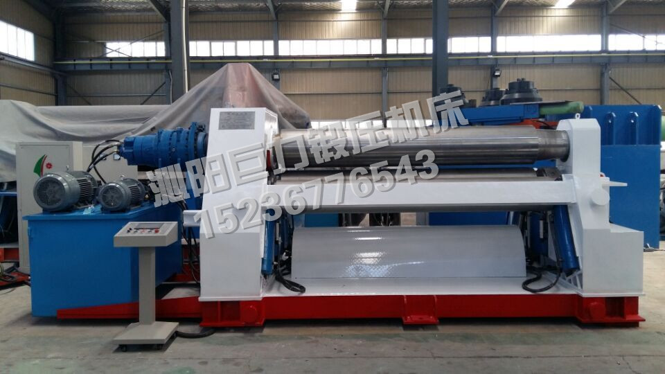 該四輥卷板機與對稱三輥卷板機比較,它可以不借助其它設備模具,直接予彎板材端部,而且剩余直邊較??;它可以不使板材調頭,而卷成工件。