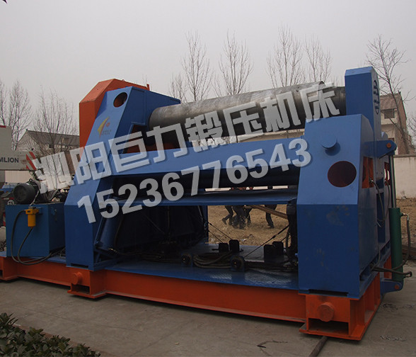 該四輥卷板機(jī)與對(duì)稱三輥卷板機(jī)比較,它可以不借助其它設(shè)備模具,直接予彎板材端部,而且剩余直邊較小;它可以不使板材調(diào)頭,而卷成工件。